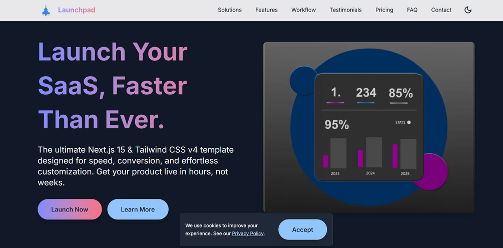 LaunchPad – The High-Converting SaaS & Startup Landing Page Template 🚀 Launch your SaaS landing page in minutes, not weeks, with this modern, lightning-fast Next.js 15 & Tailwind CSS v4 template. Perfect for SaaS founders, indie makers, agencies, and developers who want a polished, conversion-focused landing page ready out-of-the-box. ✅ No coding required – fully customizable light/dark themes ✅ SEO & analytics pre-integrated ✅ Secure, backend-free forms Start building professional, mobile-first, SEO-optimized landing pages that convert visitors into customers today!